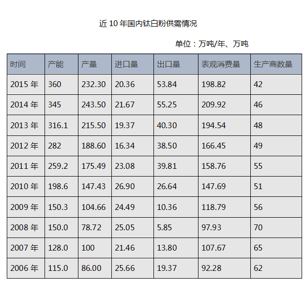 截至2009年底,全球钛白粉总产能为570万吨/年,国外的钛白粉发展较慢,平均每年增幅为3%—5%?010年全球多家钛白粉厂被关停,其中,美国关闭?家,西欧关闭?家,东欧关闭?家。?009?011年间,国内钛白粉产以每年30%的增长幅度快速弥补了上述缺口?013年国内产能一举突?00万吨/年大关?013年以后,产能增幅开始减缓,2014年增幅降?.2%?015年降?.3%,产能增幅已逐步回归到与经济增长相适应的水 、/p>