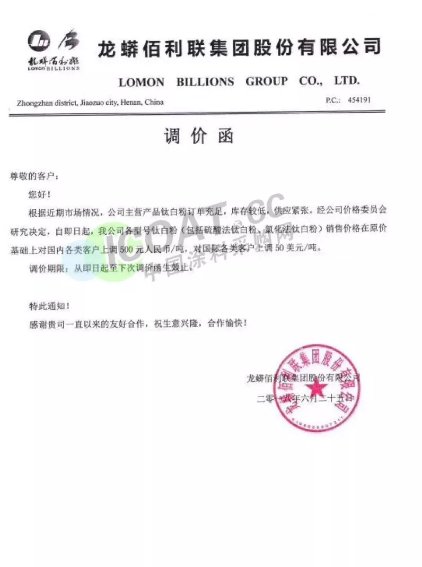 中国粉体网讯前段时间,龙蟒佰利联、中核钛白等各大钛白粉龙头企业都有封单的动作,据涂料采购网最新消息,龙蟒佰利联已率先发布提价通知称,根据近期市场情况,公司主营钛白粉订单充足,库存较低,供应紧张。经公司价格委员会研究决定,??5日起,公司各型号钛白?包括硫酸法钛白粉、氯化法钛白?销售价格在原价基础上对国内各类客户上调500元人民币/吨,对国际各类客户上?0美元/吨。调价通知如下9/p>