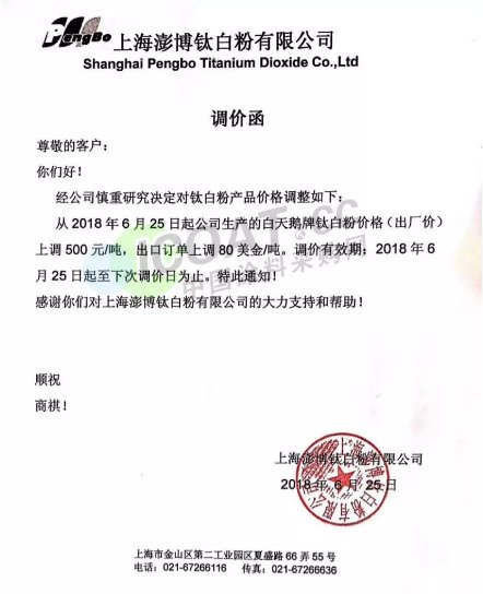 上海澎博钛白粉有限公司发布调价通知称,??5日起公司生产的天鹅牌钛白粉价?出厂?上调500?吨,出口订单上调80美金/吨。调价通知如下9/span>