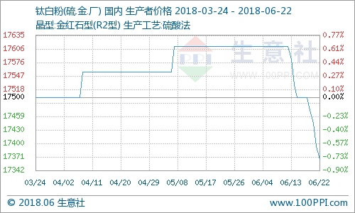 第二张图中,是近期钛白粉价格变化趋势图,从图中我们可以很直观的发现,进入6月份以来,特别是六月下旬,钛白粉价格直速下滑,主要原因是受到环保高压影响,钛白粉下游企业关停较多,需求收缩。另外,广西等地区钛白粉生产商也出现?停产,该地区开工率下降,产业链内开工率双下滑,对下游影响更大一些,所以钛白粉市场交投弱势、/p>