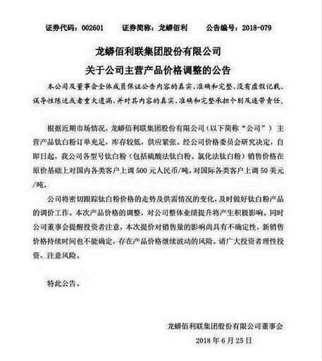 龙蟒佰利6?4晚间公告,公司主营产品钛白粉订单充足,库存较低,供应紧张。自即日起,公司各型号钛白粉(包括硫酸法钛白粉、氯化法钛白粉)销售价格在原价基础上对国内各类客户上调500元人民币/吨,对国际各类客户上?0美元/吨、/p>