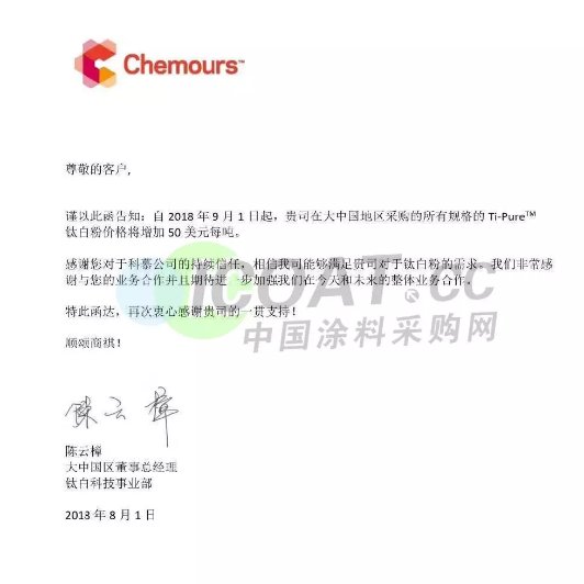 谨以æ¤å‡½å‘ŠçŸ¥ï¼šè‡ª2018å¹?æœ?日起,贵å¸åœ¨å¤§ä¸å›½åœ°åŒºé‡‡è´çš„æ‰€æœ‰è§„æ ¼çš„Ti-Pure?é’›ç™½ç²‰ä»·æ ¼å°†å¢žåŠ 50美元æ¯å¨ã€ü/p>