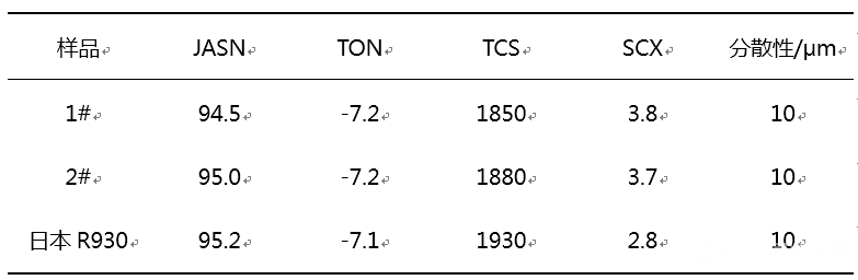 ZrO2/Al2O3包膜后的TiO2颜料特性值如?所示。颜料特性值符合基本要?且部分指标达到日本R930标样水平、/span>