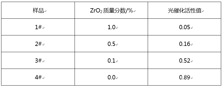 ZrO2包覆量获得的包膜钛白的光催化活性值如?所示。包覆的量达?%(质量分数,以TiO2??光催化活性值为0.05,耐候性最高。样?#是国内某厂单铝包膜钛白粉的光催化活性?显然,锆铝包膜效果强于单铝包膜、/span>