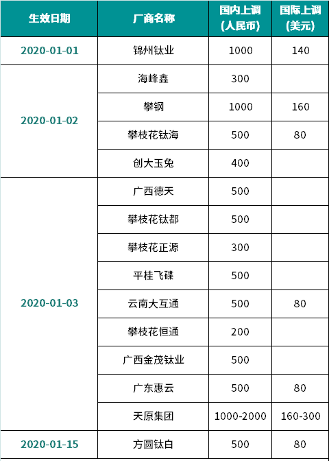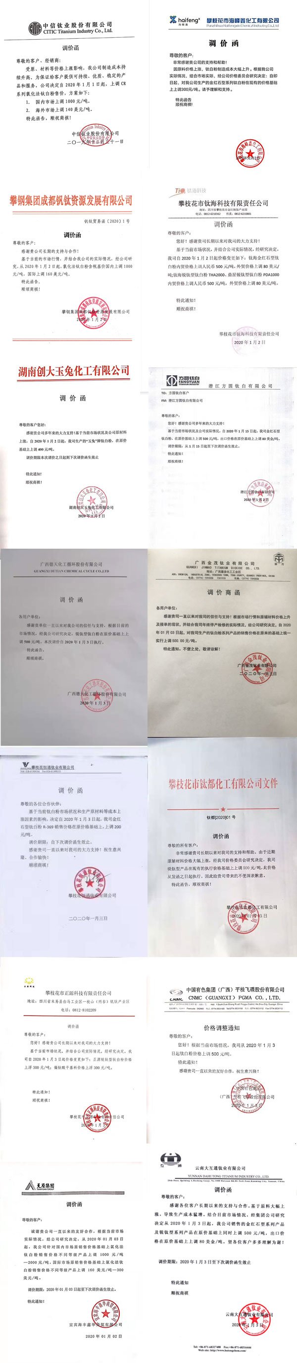 新年第一天,中信钛业(原锦州钛业)打响了新年涨价剧目的前奏,发布调价函。据报道?020??日,锦州钛业宣布旗下钛白粉提价,其国内市场上?000?吨,国外市场上调140美元/吨、/span>