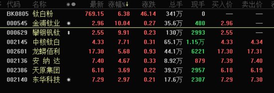 受近期钛白粉即将涨价消息的影响,钛白粉板块强势崛起,周五收涨6.29%,涨幅位居所有板块第一。板块内个股涨幅都超?%,攀钢钒钛、金浦钛业涨停,中核钛白收涨7.71%,龙蟒佰利收?.68%、/p>