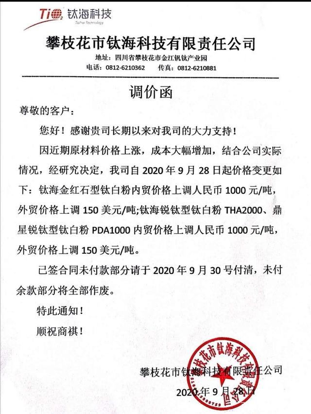 中国粉体网讯2020??8日,攀枝花钛海科技有限责任公司发布钛白粉调价函通知。基于当前的原材料价格上涨,成本大幅度增加,结合公司实际情况,经公司研究决定,自即日起,公司钛海金红石型钛白粉国内价格上?000?吨,国外价格上调150美元/吨。钛海锐钛型钛白粉THA2000、鼎星锐钛型钛白粉PDA1000国内价格1000?吨,国外价格上调150美元/吨、br/>