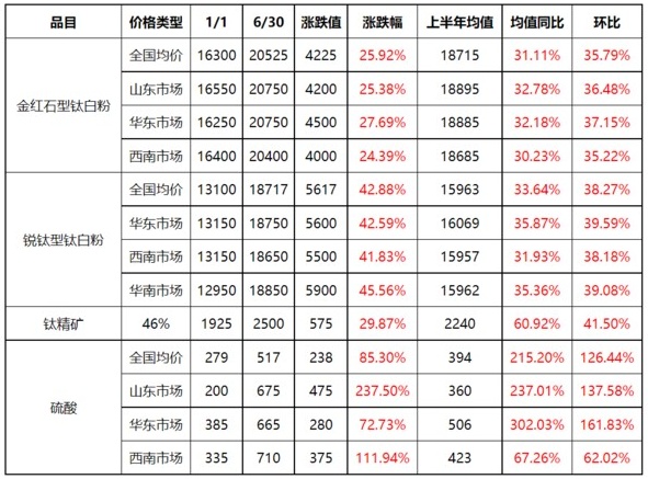 据了解,2021钛白粉产业链上下游“业绩”全面飘红。上半年钛精矿、硫酸及钛白粉价格悉数呈现超20%的涨幅,同时同比2020年上半年、环?020年下半年变动幅度均“飘红”、/p>