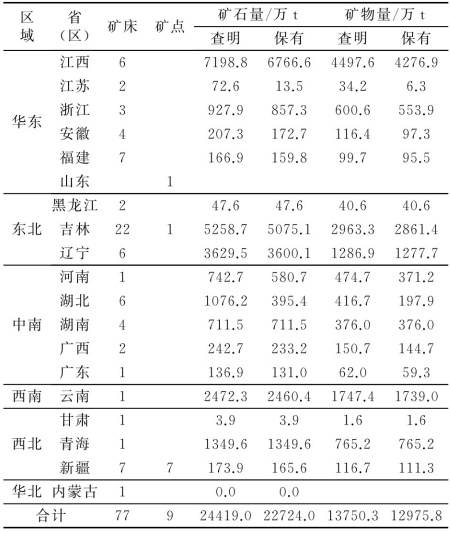 ?7处矿床中,查明硅灰石矿石?.44亿t,保有硅灰石矿石?.27亿t。其中,超大型查明矿石量15062.2万t,保有矿石量14890.7万t;大型查明矿石量6592.8万t,保有矿石量5400.2万t;中型查明矿石量2303.4万t,保有矿石量2031.3万t;小型查明矿石量460.6万t,保有矿石量401.8万t?个超大型矿床的资源储量占全国?0%以上、/p>