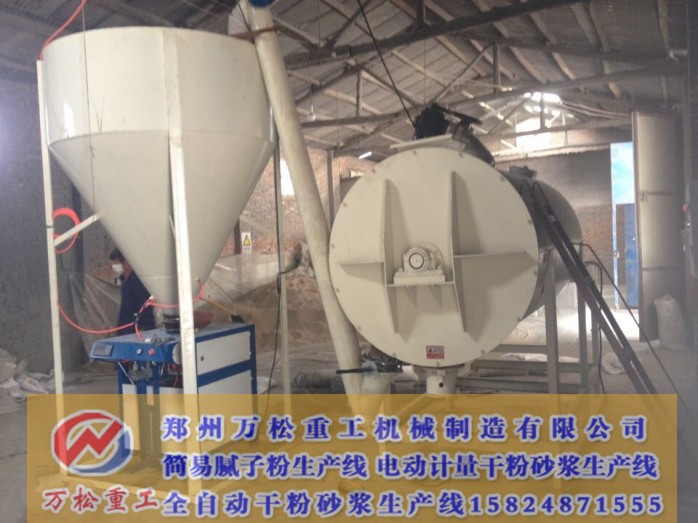 干粉砂浆成套设备,是郑州万松重工机械制造有限公?*研发的干粉砂浅/span>,腻子粉生产设备。主要由上料朹/span>,混合朹/span>,提升朹/span>,储料仒/span>,自动称量包装机等组成。该设备设计紧凑,性能优良,2-3人可操作。各种原料从一个料斗上斘/span>,先投入水泥跟纤维等添加剂搅拌3分钟,然后加入石英砂搅拋/span>4分钟即可将产品提至储料仓进行计量包装。该设备操作简侾/span>,效率髗/span>,主机容量1.6立方,每次入料1?/span>,每小时可生产5吨左右、/span>