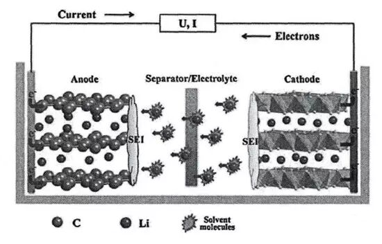 如上图所示。在充电过程中,由于电池外加端电压的作用,正极集流体附近的电子在电场驱动下向负极运动,到达负极后,与负极材料中的锂离子结合,形成局部电中性存放在石墨间隙?消耗了部分锂离子的负极表面,锂离子浓度变低,正极与负极之间形成离子浓度差。在浓差驱动下,正极材料中的锂离子从材料内部向正极表面运动,并沿着电解质,穿过隔膜,来到负极表靡进一步在电势驱动作用下,向负极材料深处扩散,与从外电路过来的电子相遇,局部显示电中性滞留在负极材料内部。放电过程则刚好相反,包含负载的回路闭合后,放电过程开始于电子从负极集流体流出,通过外电路到达正?终于锂离子嵌入正极材料,与外电路过来的电子结合、/span>