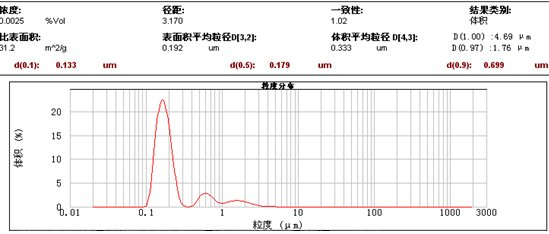 要求:需要研磨分散后物料大颗粒粒径在20-100um,同时验证多种材料研磨分散后的均匀分布、br/> 先研磨:出料粒径d50=0.179um,D90=0.699um