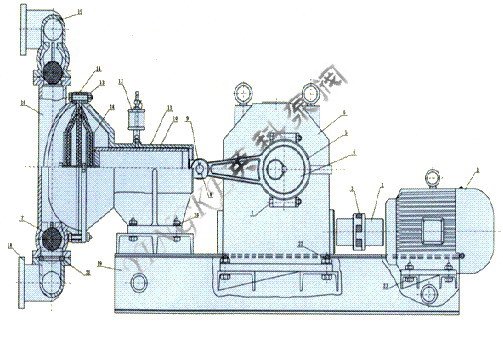 电机?)通过减速箱?)带动左右两端柱塞上面的隔膜?)一前一后往复运动。在左右两个泵腔内,装有上下四个单向球阀(1)隔膜的运动,造成工作腔内的容积的改变,迫使四个单向球阀交替地开启和关闭,从而将液体不断地吸入和排出、/span>