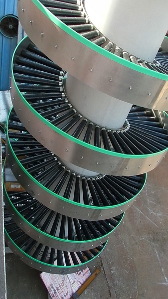螺旋滚筒输送机又称为螺旋降箱机,通过将机架制作成螺旋状,一般为无动力结构,可用于输送量较大的纸箱、袋装产品的连续式下降输送;