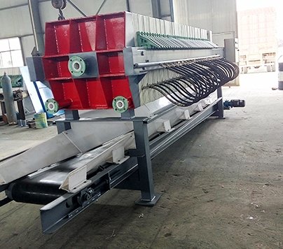 在压滤机滤板下方装置了皮带输送,用于输送滤板拉开时卸下的滤饼。该装置适用于不易做基础的工作现场,可以把物料输送到指定的地方,减轻了员工劳动强度,工作环境得到改善。本发明还在传统输送带的基础上做了改进,使压滤液会因重力作用全部自动流到接水装置中,出泥端不会有压滤液流出而使压干的污泥再次潮湿,压滤液也不会流到地面上、/p>