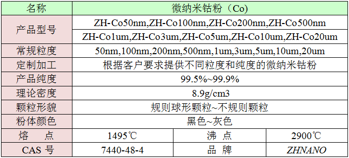 微纳米钴粉通过气相蒸发冷凝法制备,纯度高、粒径小,球形度高,松装密度小,颗粒均匀,颗粒度分布区间窄,大小可控,比表面积大,溶于酸,有磁性,溶于酸,有磁性,在潮湿空气中易氧化、br/>产品应用